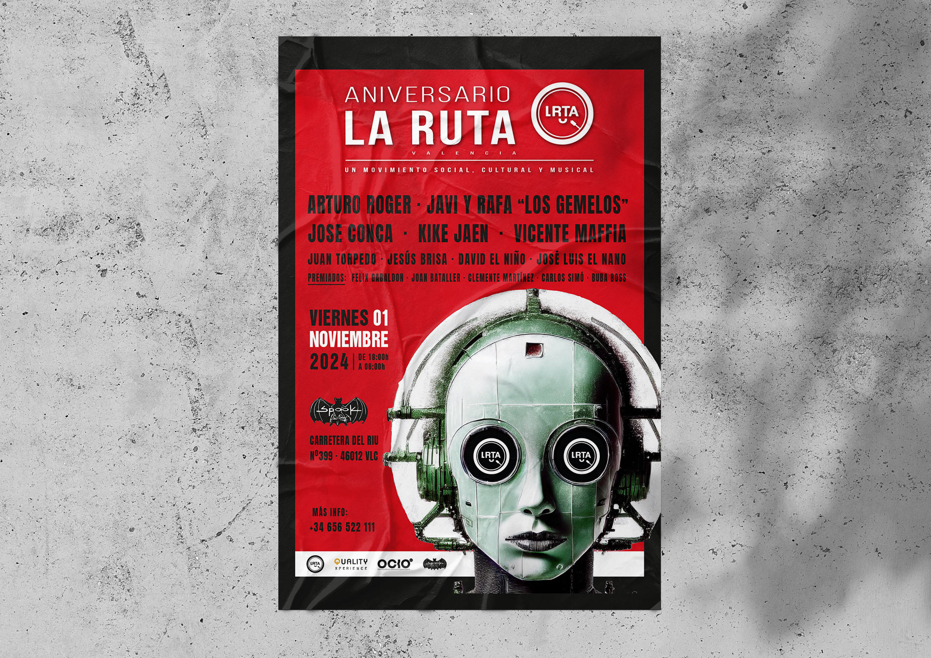 Estem molt contents d'haver dissenyat els cartells i les samarretes per a l'aniversari de La Ruta. Una sessió única i irrepetible del 2024 on reviure els anys daurats de LA RUTA de València.